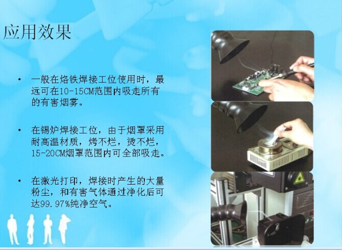 焊錫煙霧凈化器為什么會得到大家的青睞--------這個問題可以從幾個方面去分析,第一隨著社會的發(fā)展,人們越來越注重健康問題,焊錫的煙霧其實(shí)也就是鉛錫焊,在焊接的過程中,有一定量的揮發(fā),如果不加以防范的話就會吸入我們的身體內(nèi),而且會沉淀于我們的身體內(nèi),給我們的身體帶來很大的傷害,鉛進(jìn)入人體后,除部分通過糞便、汗液排泄外,其余在數(shù)小時后溶入血液中,阻礙血液的合成,導(dǎo)致人體貧血,出現(xiàn)頭痛、眩暈、乏力、困倦、便秘和肢體酸痛等;有的口中有金屬味,動脈硬化、消化道潰瘍和眼底出血等癥狀也與鉛污染有關(guān)。小孩鉛中毒則出現(xiàn)發(fā)育遲緩、食欲不振、行走不便和便秘、失眠;若是小學(xué)生,還伴有多動、聽覺障礙、注意不集中、智力低下等現(xiàn)象。這是因為鉛進(jìn)入人體后通過血液侵入大腦神經(jīng)組織,使?fàn)I養(yǎng)物質(zhì)和氧氣供應(yīng)不足,造成腦組織損傷所致,嚴(yán)重者可能導(dǎo)致終身殘廢。所以我們在焊接的時候,應(yīng)該有一個良好的凈化設(shè)備來保障我們自己的健康-焊錫煙霧凈化器
